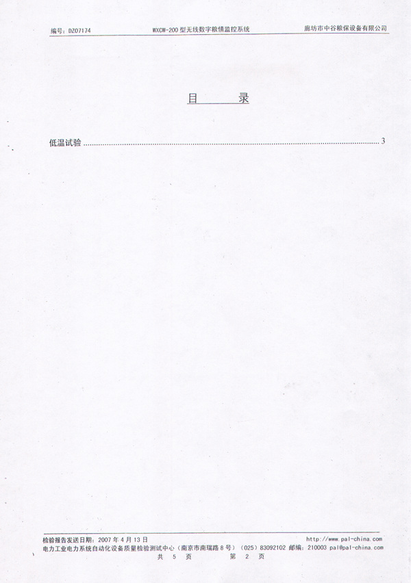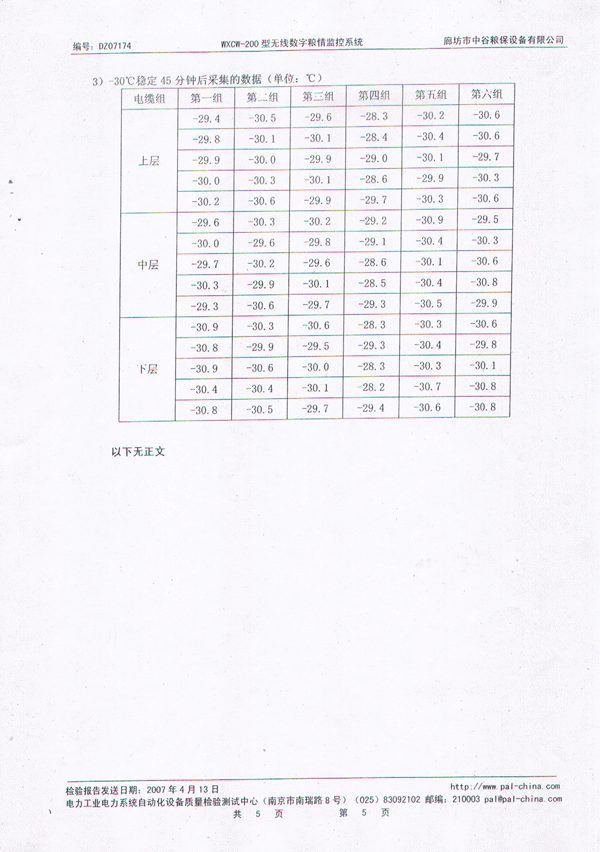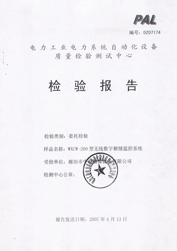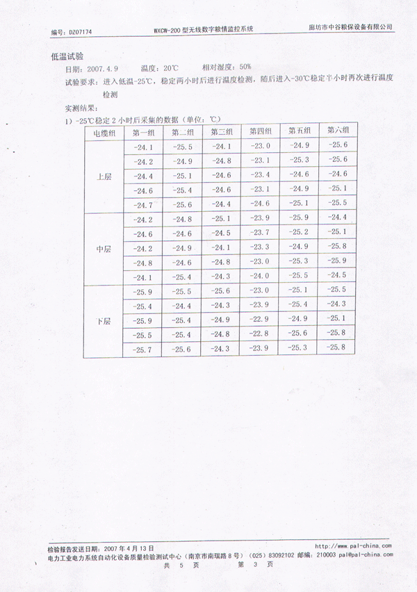 中谷糧保無(wú)線(xiàn)數字糧情監控系統檢測報告